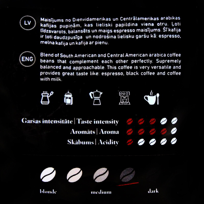 Maisījums no Dienvidamerikas un Centrālamerikas Arabikas kafijas pupiņām, kas lieliski papildina viena otru. Ļoti līdzsvarots, balansēts un maigs espresso maisījums. Šī kafija ir ļoti daudzpusīga un krēmīga, kas nodrošina lielisku garšu kā: espresso, melna kafija un kafija ar pienu.